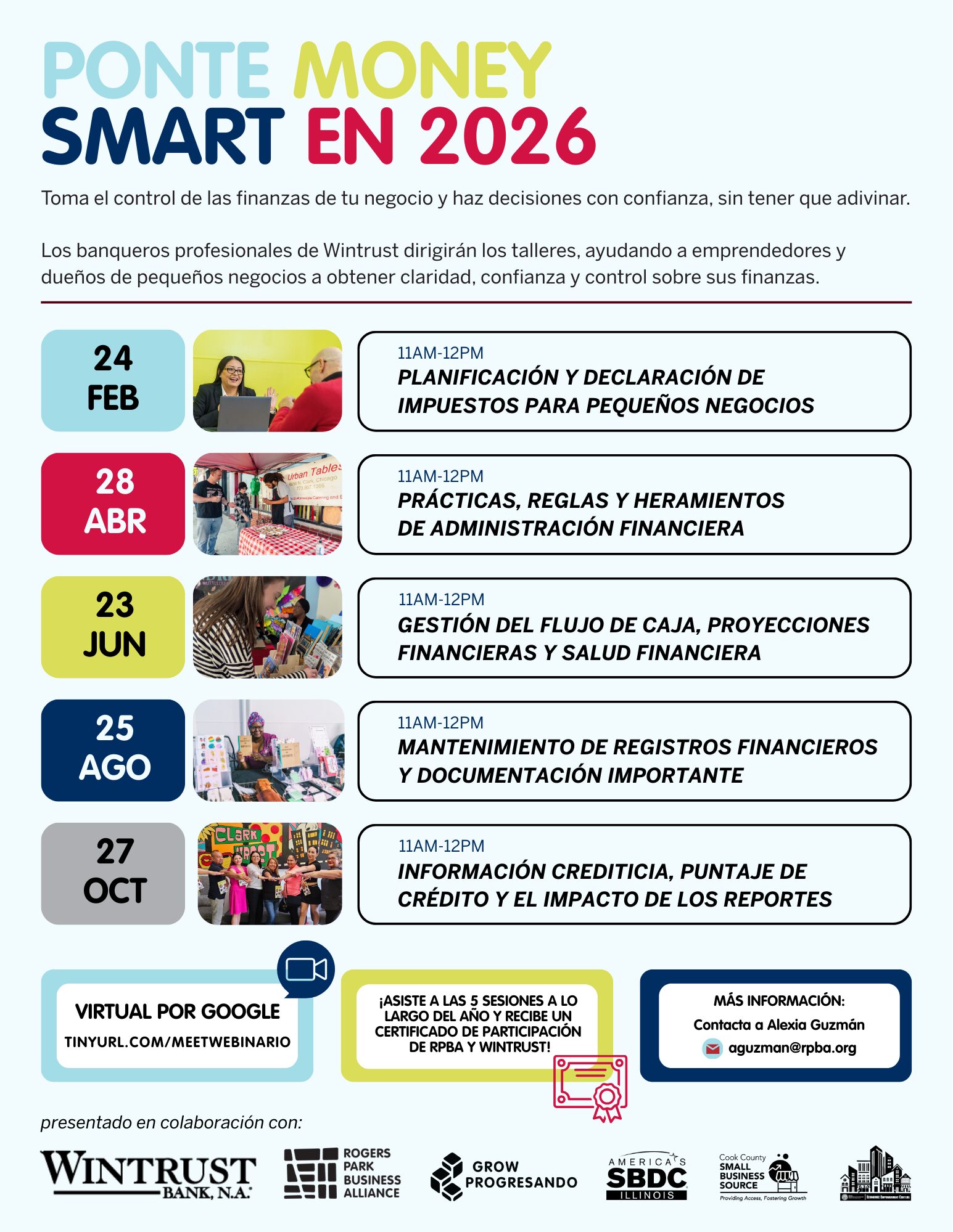 Los banqueros profesionales de Wintrust dirigirán los talleres, ayudando a emprendedores y dueños de pequeños negocios a obtener claridad, confianza y control sobre sus finanzas.