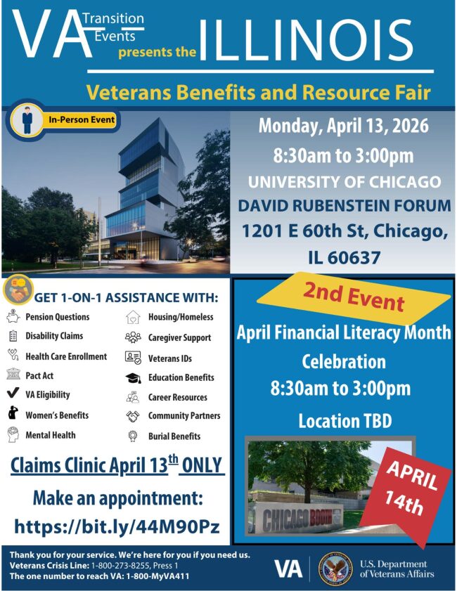 The U.S. Department of Veterans Affairs (VA) will host an in-person Benefits and Resource fair in Chicago, Illinois. This event is for Veterans, service members, and their families.